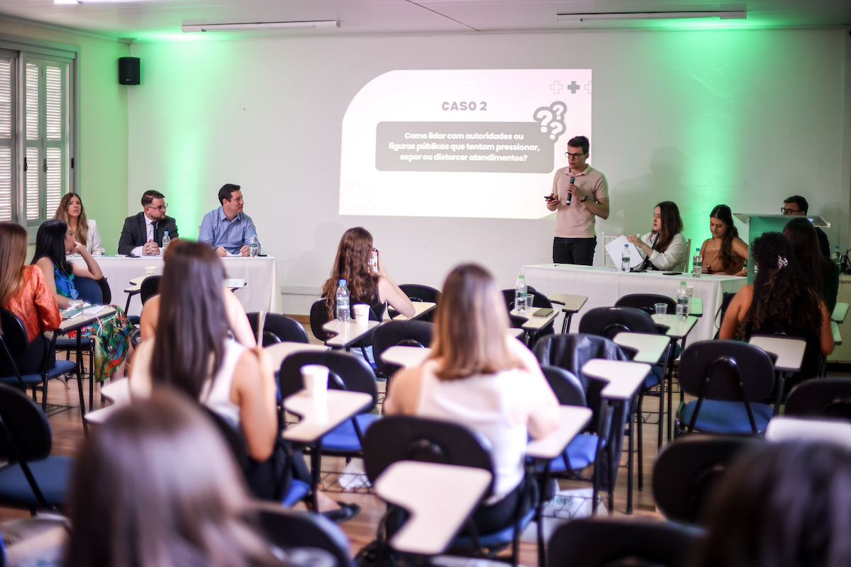 A dinâmica “Nem tudo está nos livros. E agora doutor?” colocou os médicos e acadêmicos para apresentar soluções para problemas que podem ocorrer durante a jornada de trabalho. Os participantes foram divididos em cinco grupos e cada um recebeu um caso para avaliar e apresentar à banca formada pelos assessores jurídicos do Simers Paola Kuhn e Érick Paim e pelo conselheiro Éder Berg.
