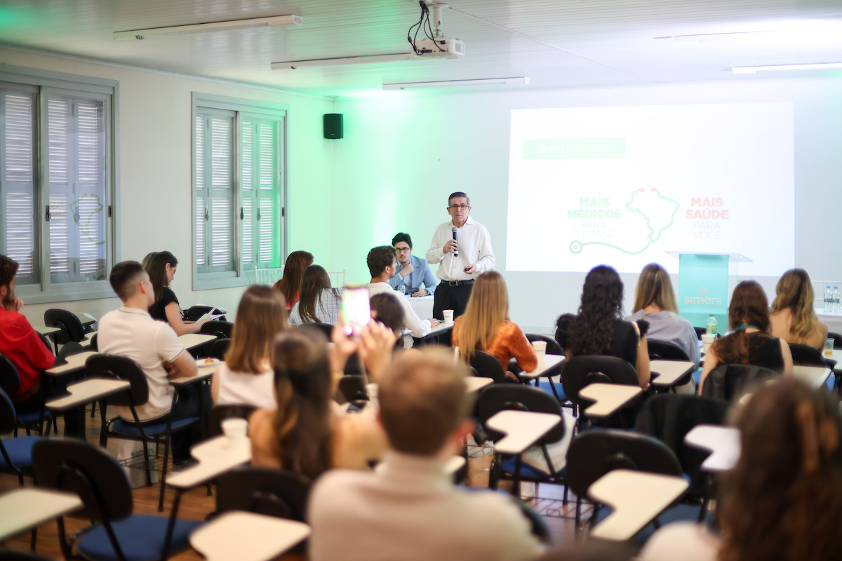 Pela manhã, aproximadamente 50 estudantes de Medicina de diferentes regiões do RS participaram do Encontro Estadual do Núcleo Acadêmico do Simers (NAS). Com o tema “Da Academia ao Futuro: a Medicina que Lidera Transformações”, o evento discutiu o papel dos futuros médicos frente aos desafios atuais da saúde no Brasil.