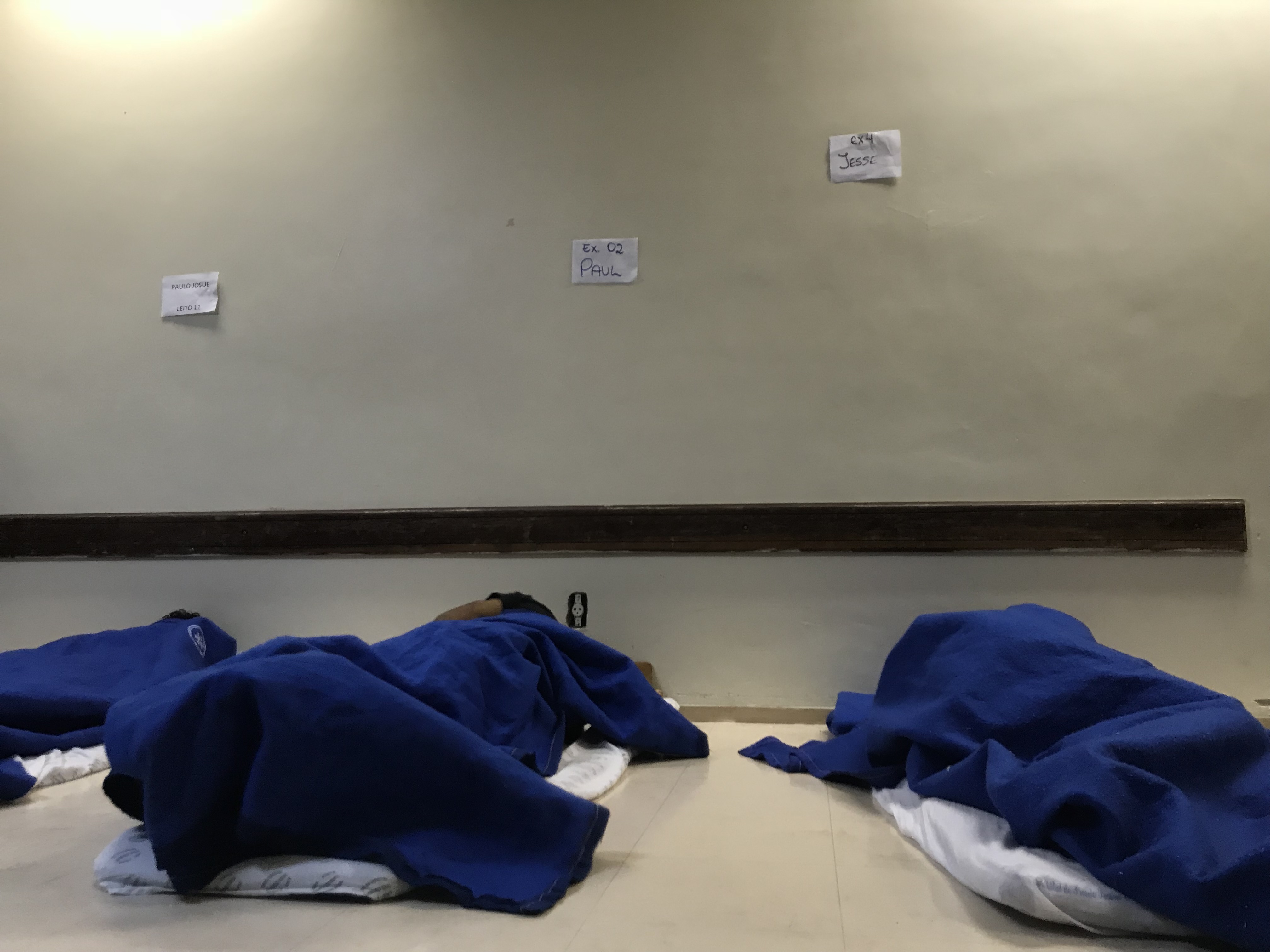 Folhas de papel coladas nas paredes identificam o leito do paciente no colchonete que fica no chão. “Ext1”, ext 2 e etc. O ”ext” significa “extra capacidade”. Na noite dessa sexta, o “ext” chegou a 19, ou seja, além dos 14 internados em leitos normais, havia mais 19 em observação acima da capacidade. Há pessoas desde 6 de maio no local, muito mais que o limite de 24 horas para definir o encaminhamento – o paciente vai para casa ou segue para uma internação, que é o que a maioria dos casos nesta noite exigiam. Dos 33 casos em observação, 13 têm dependência química.